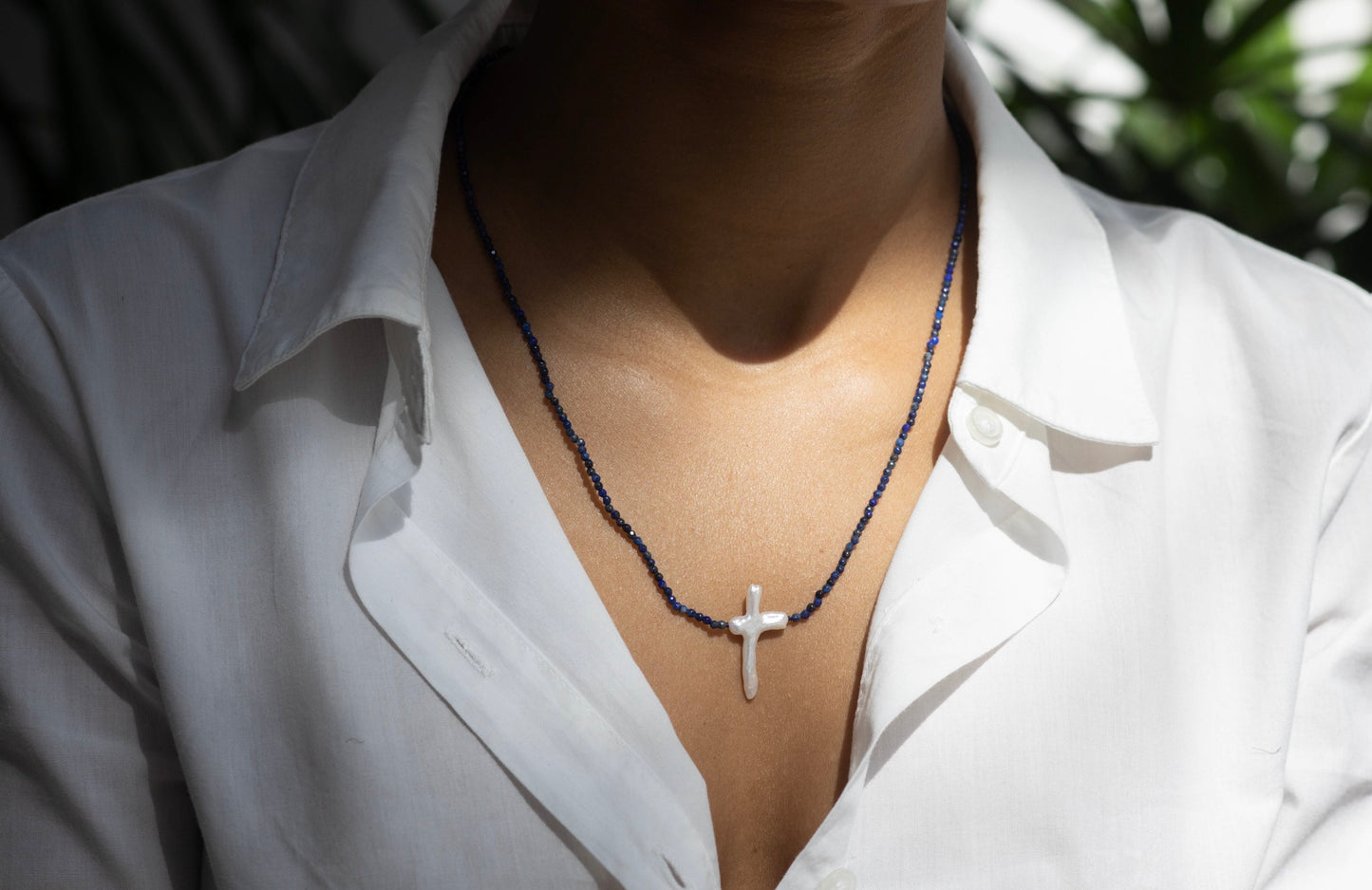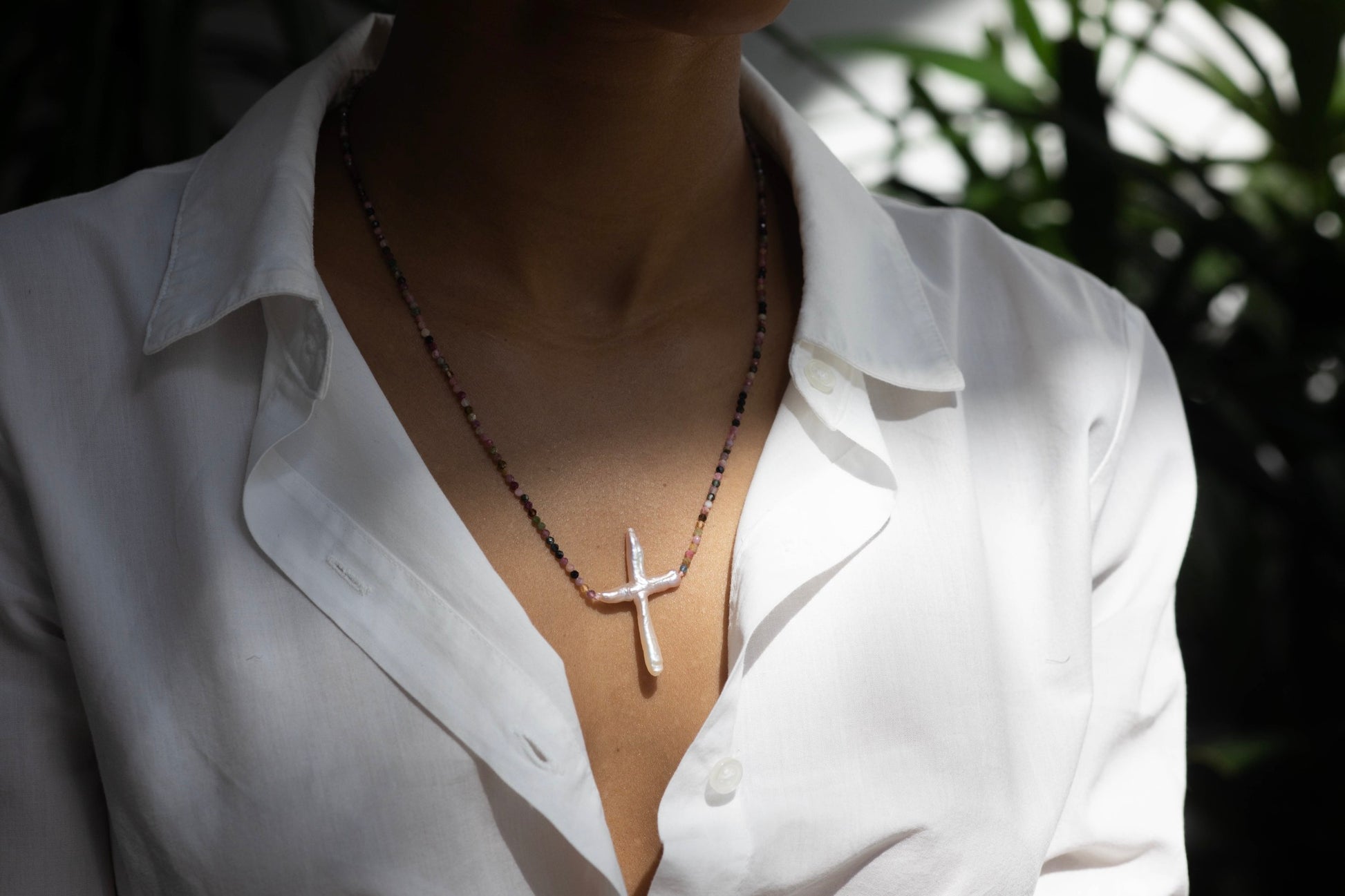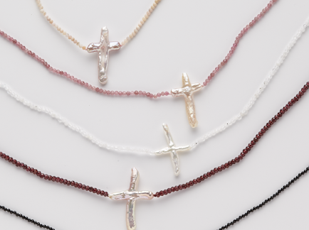 The Linny necklaces are made with your choice of real gemstones in a variety of colors and an organic cultured freshwater pearl cross.