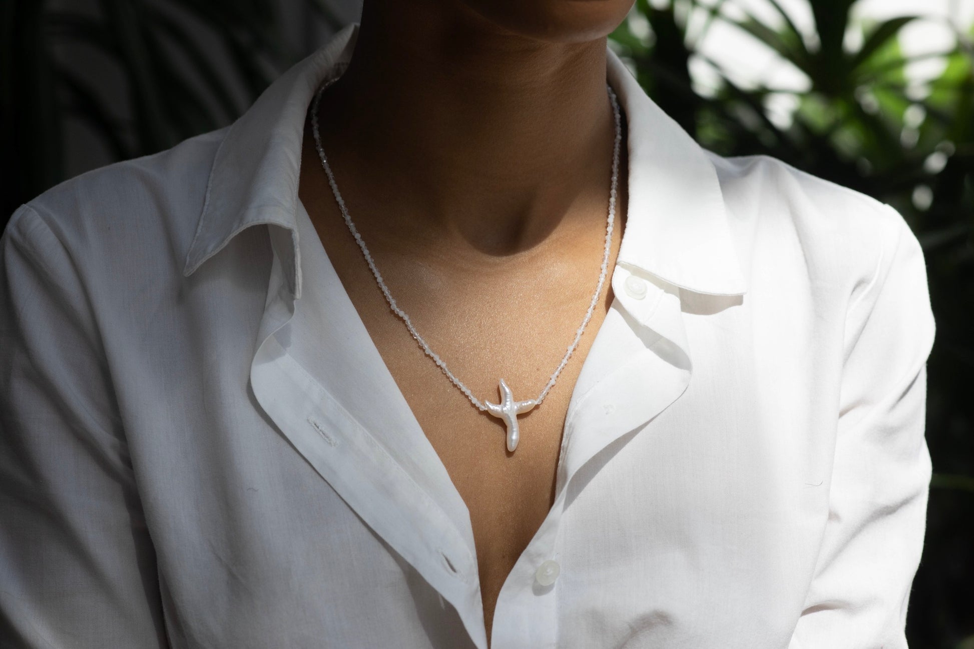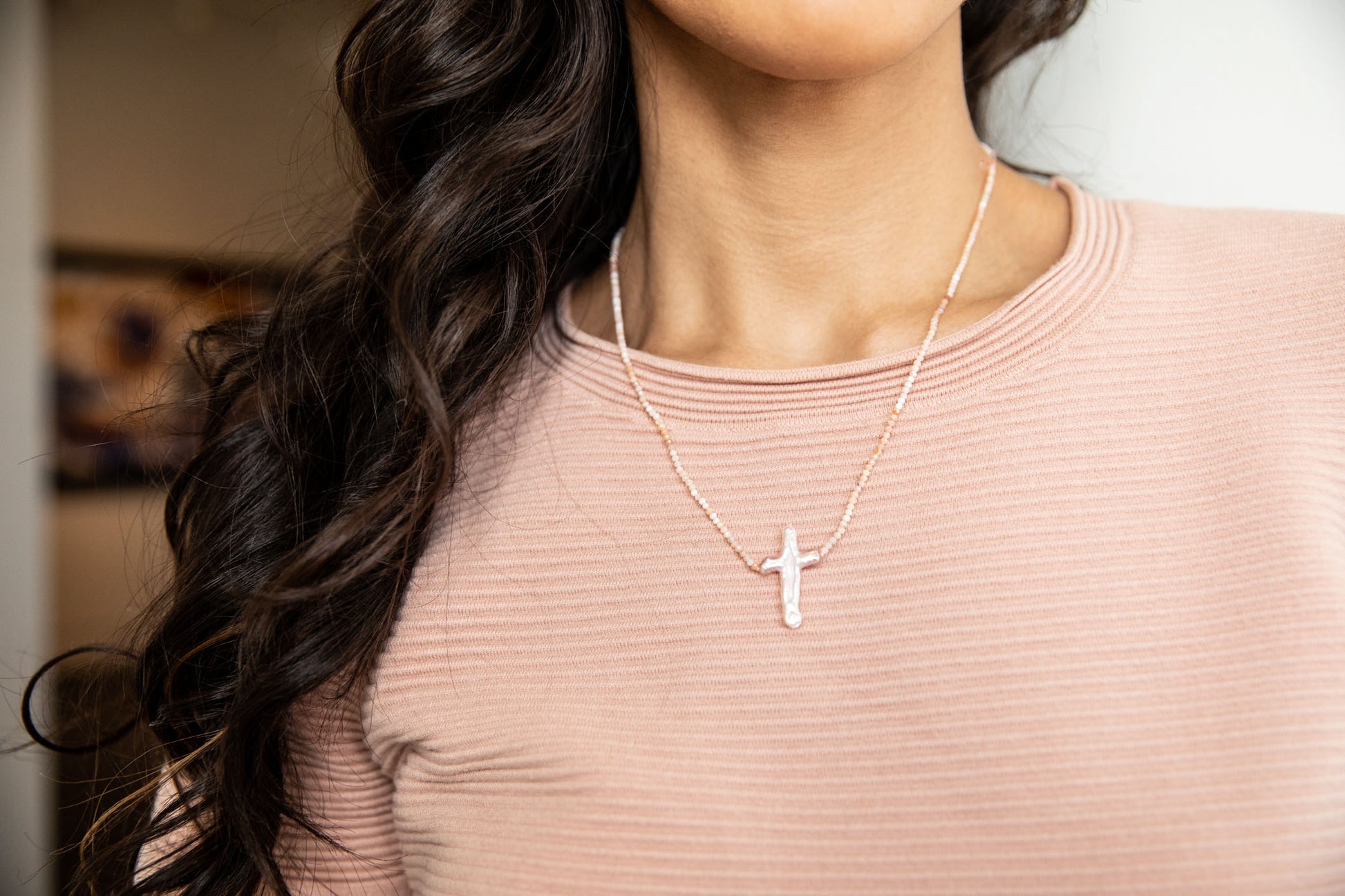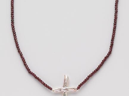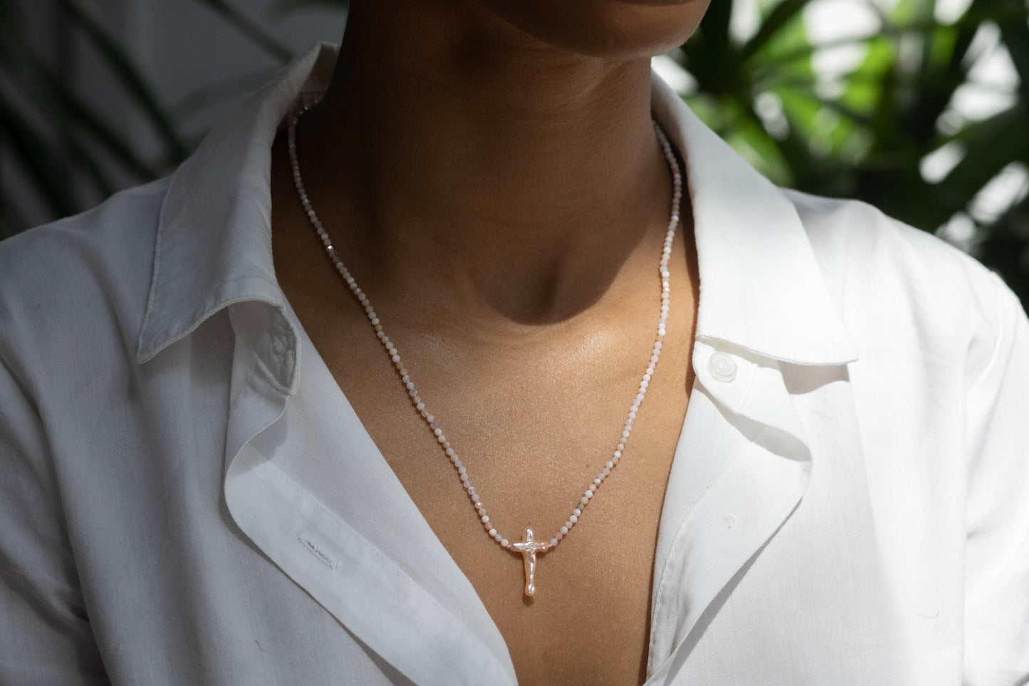 The Linny necklaces are made with your choice of real gemstones in a variety of colors and an organic cultured freshwater pearl cross.