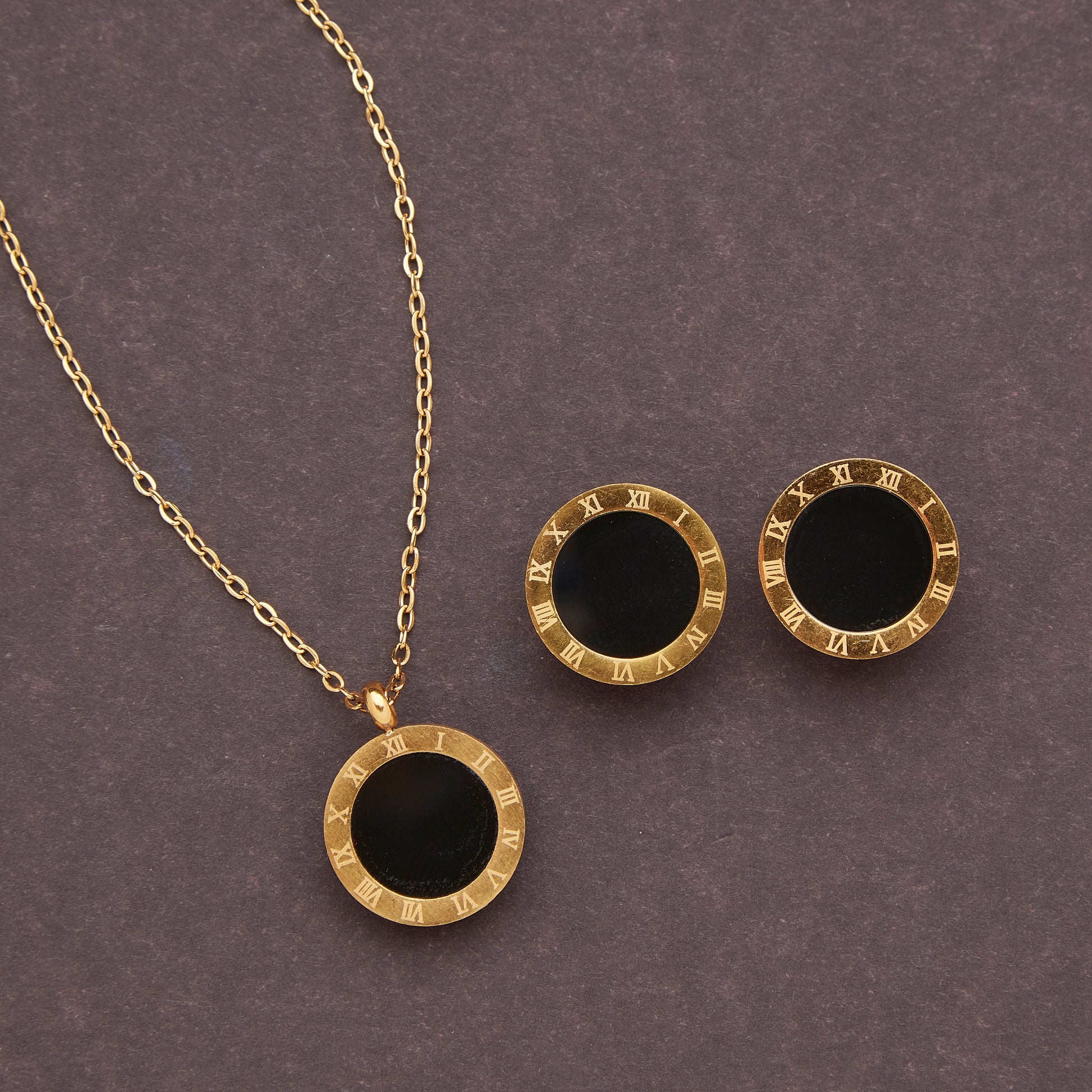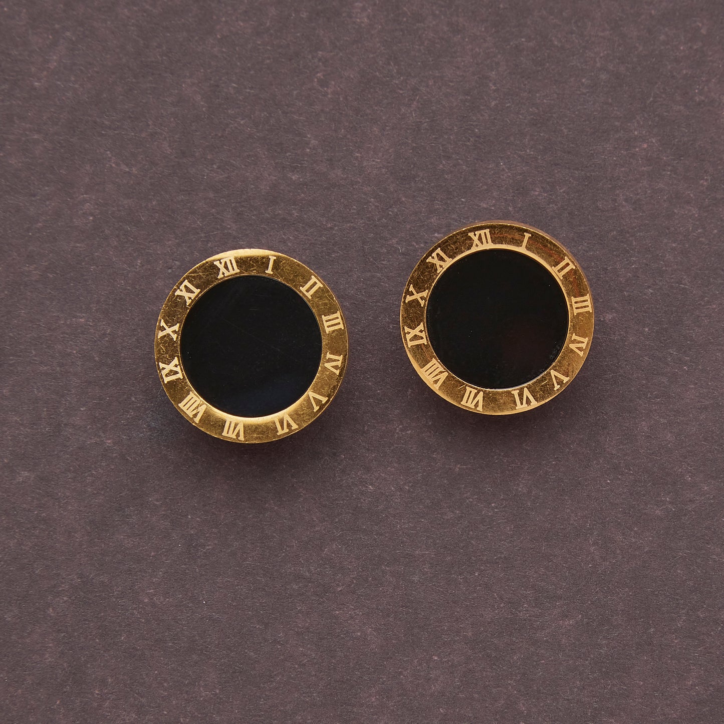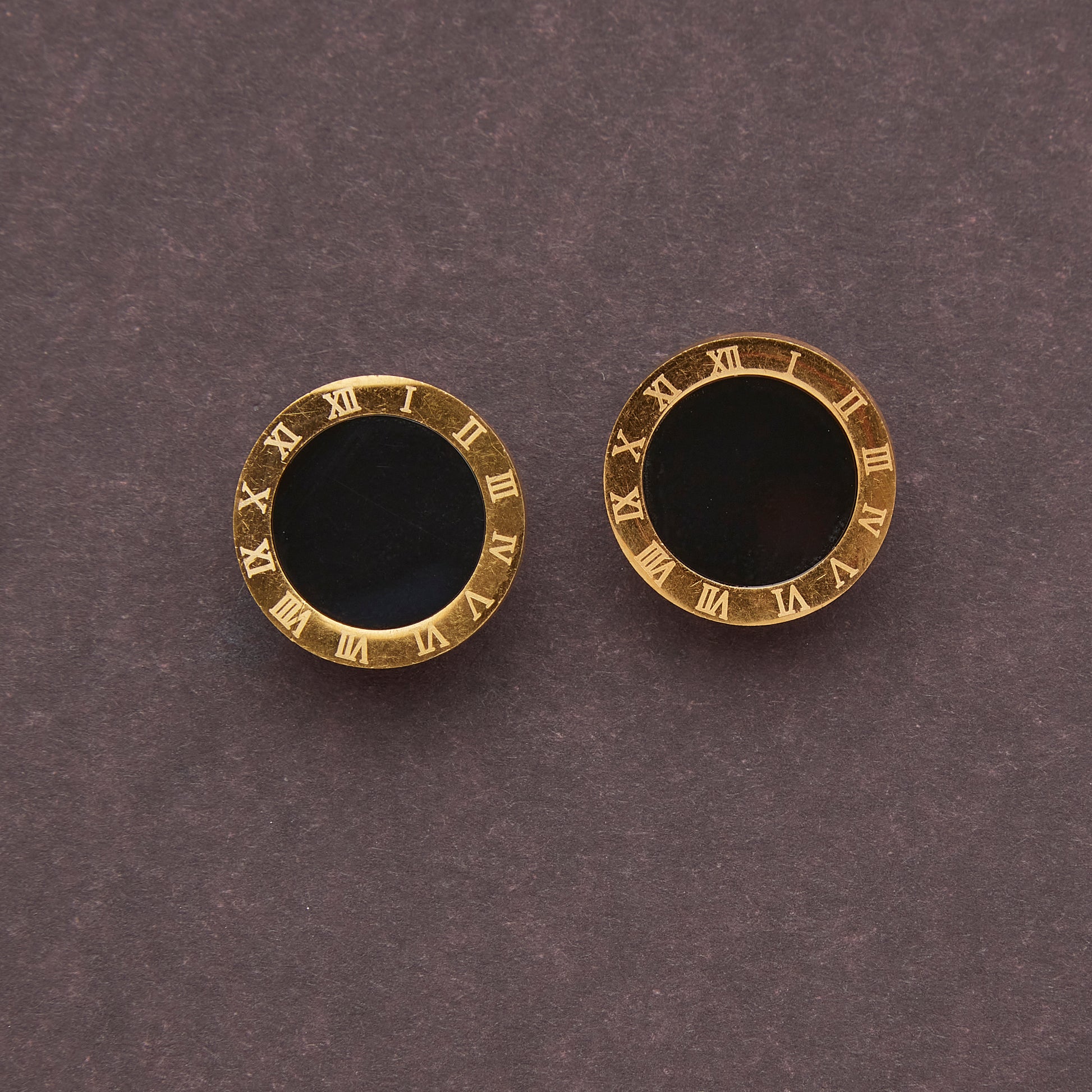 Designed in gold-tone brass, these elegant earrings take the shape of a classic clock face, with Roman numerals (I–XII) encircling a sleek black center, creating a stunning blend of vintage charm and modern sophistication.