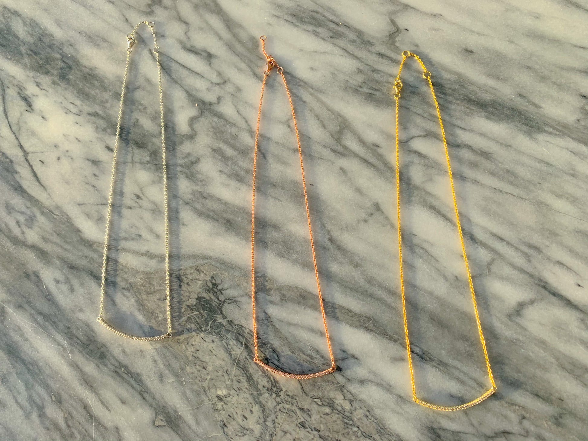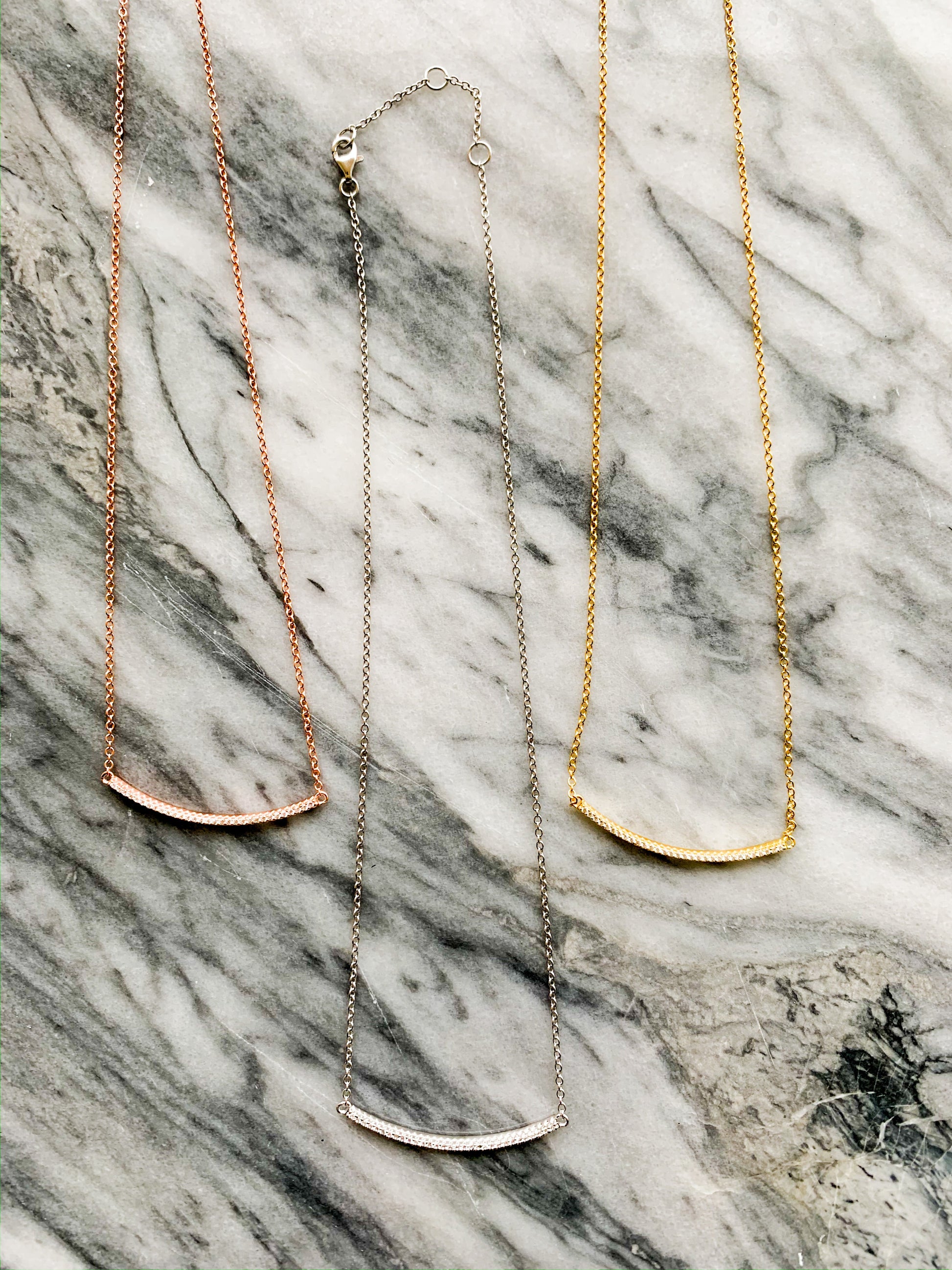 Playful skinny chain necklace in sterling silver with rose gold plating, showcasing a curved 1 inch row of sparkling cubic zirconia.
